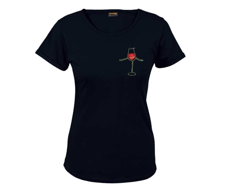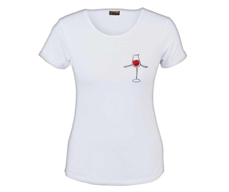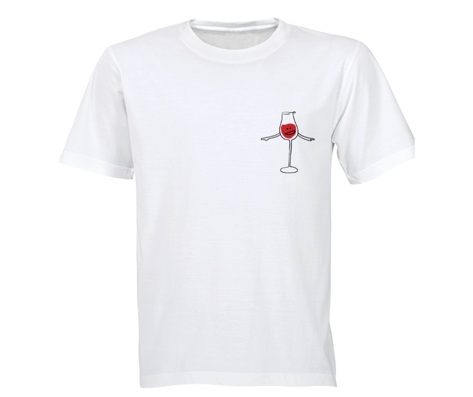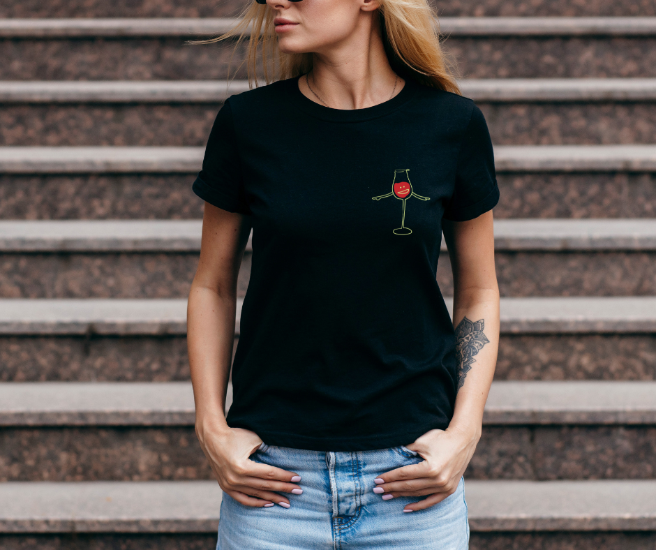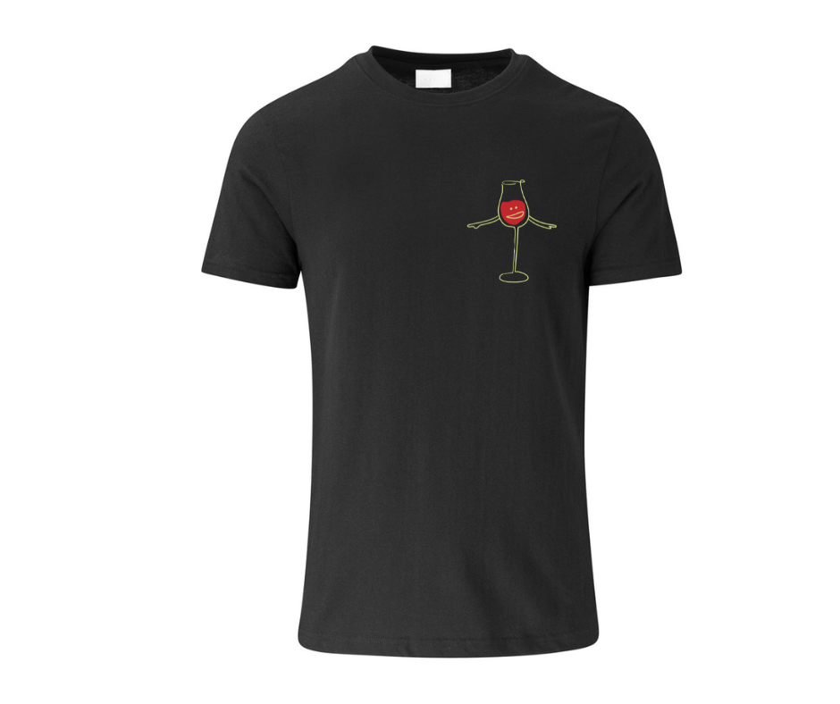 This minimalist tee features a playful hand-drawn wine glass with arms and a cheeky little face — proof that even your shirt knows when it’s wine o’clock.