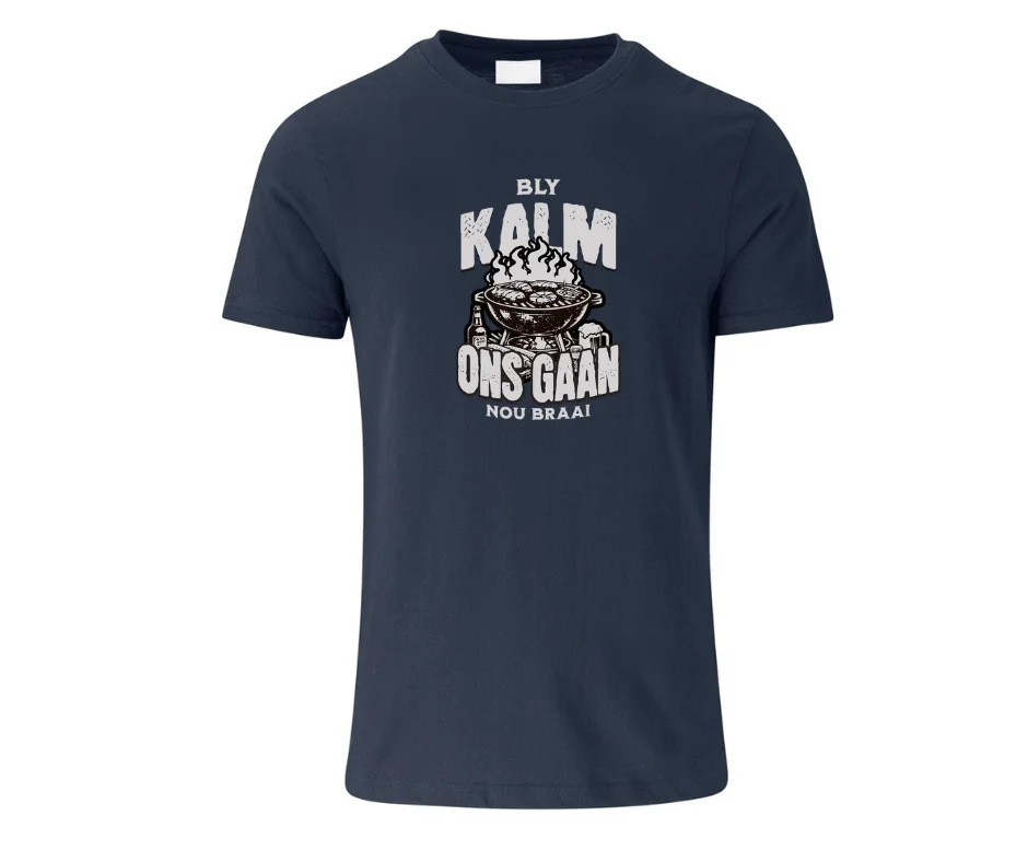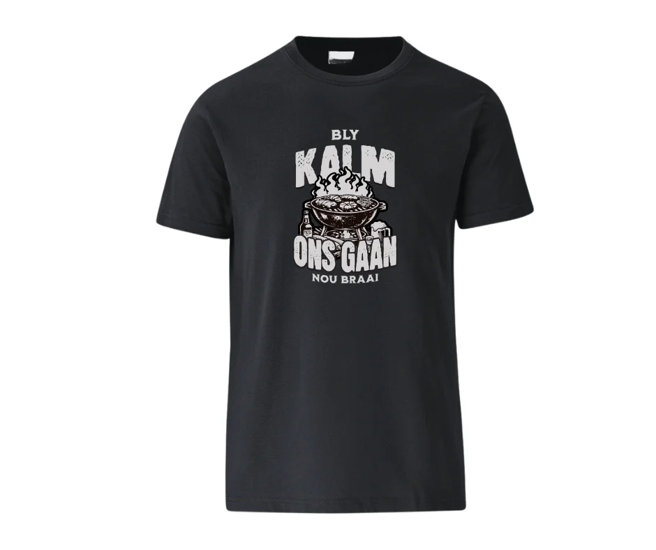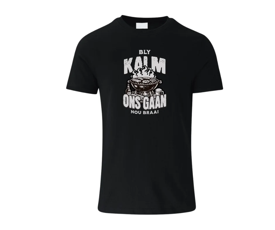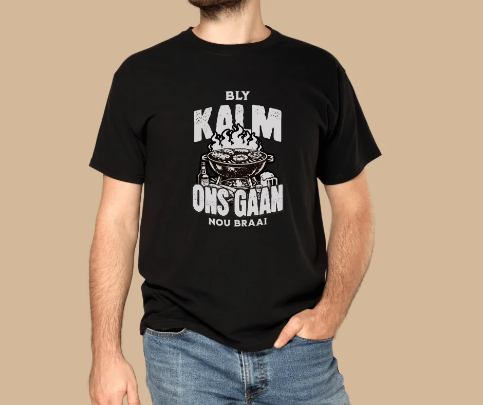 This proudly South African tee captures the ultimate stress-relief strategy — light the fire, throw on the meat, and let everything else wait. Featuring a bold braai graphic and classic Afrikaans phrase, it’s made for those who know that calm comes from coals, smoke, and good company.