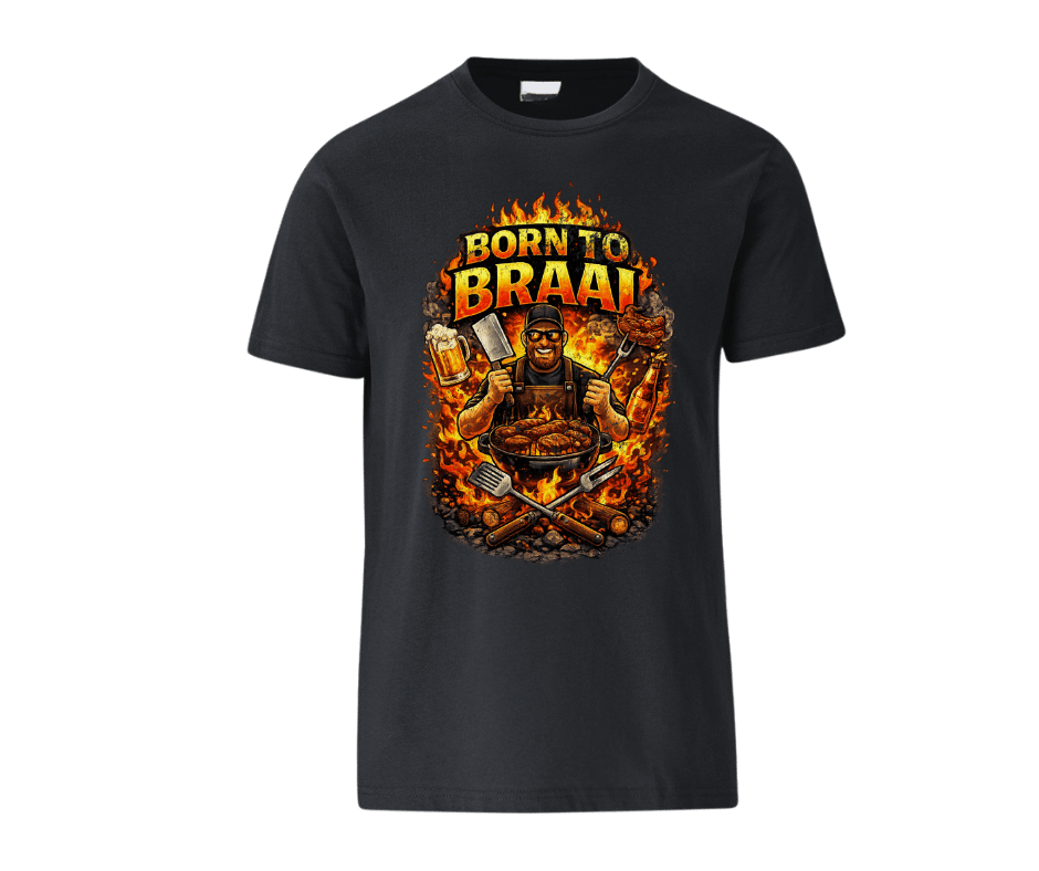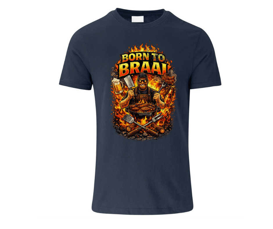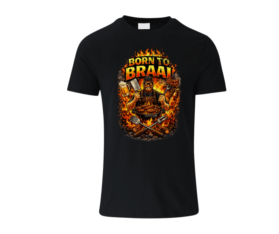 This bold, flame-filled graphic tee celebrates the true kings of the coals. Featuring a powerful braai master surrounded by fire, meat, tools, and ice-cold refreshment, this design is made for those who don’t just braai… they command the flame.