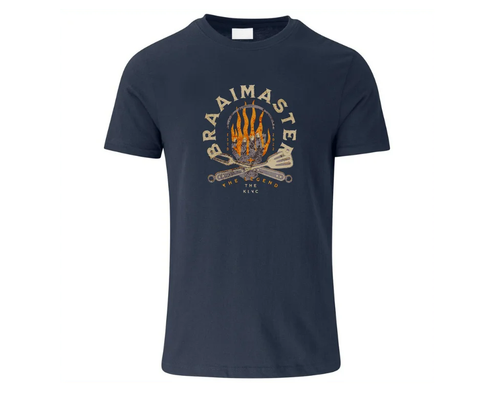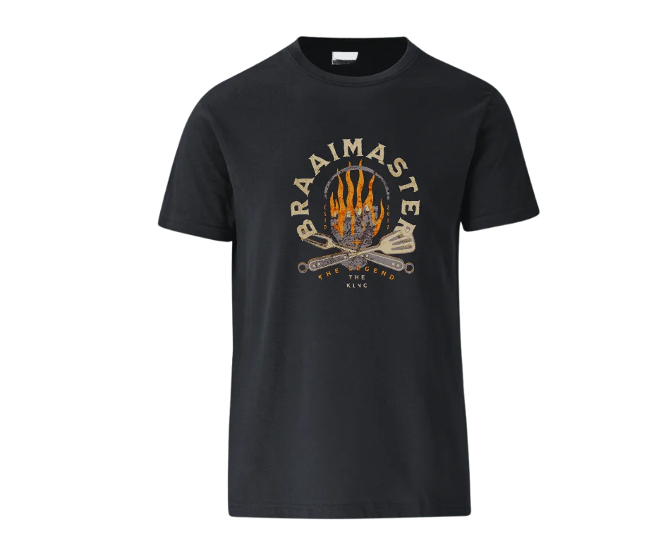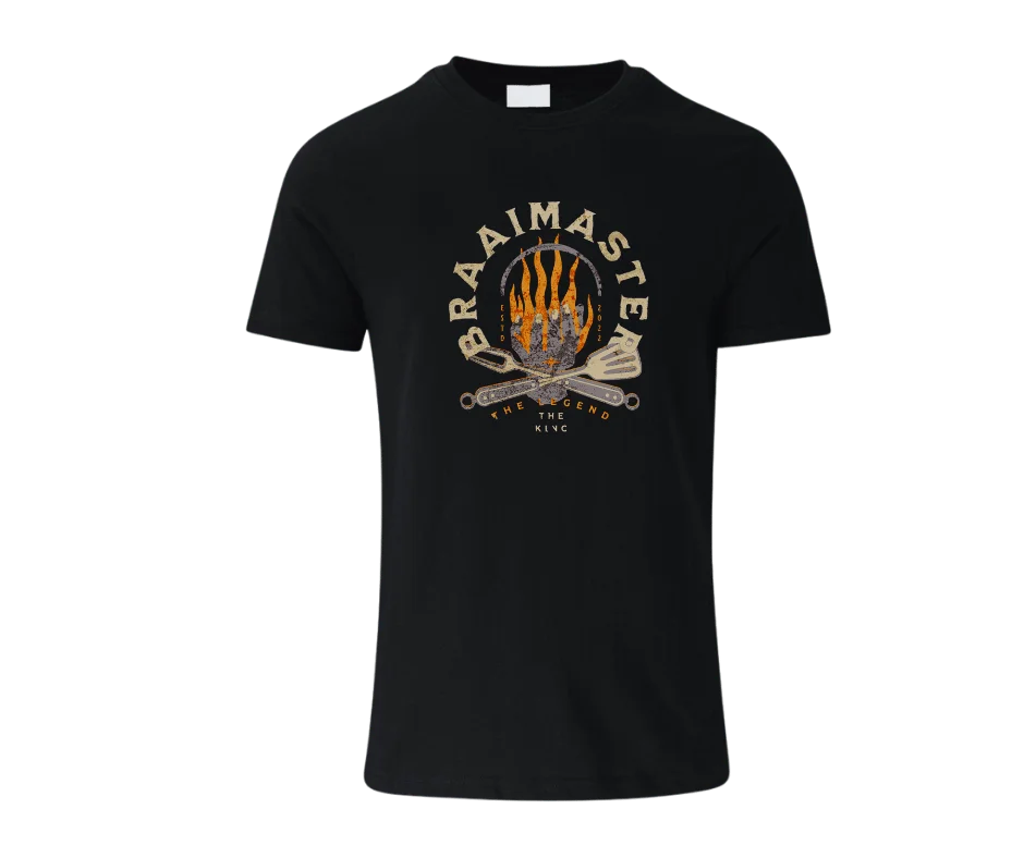 This bold graphic tee celebrates the true ruler of the grill. Featuring a striking flame emblem, crossed braai tools, and vintage-inspired typography, the Braaimaster – The Legend design is made for the one who knows exactly when to flip, when to rest, and when to serve.