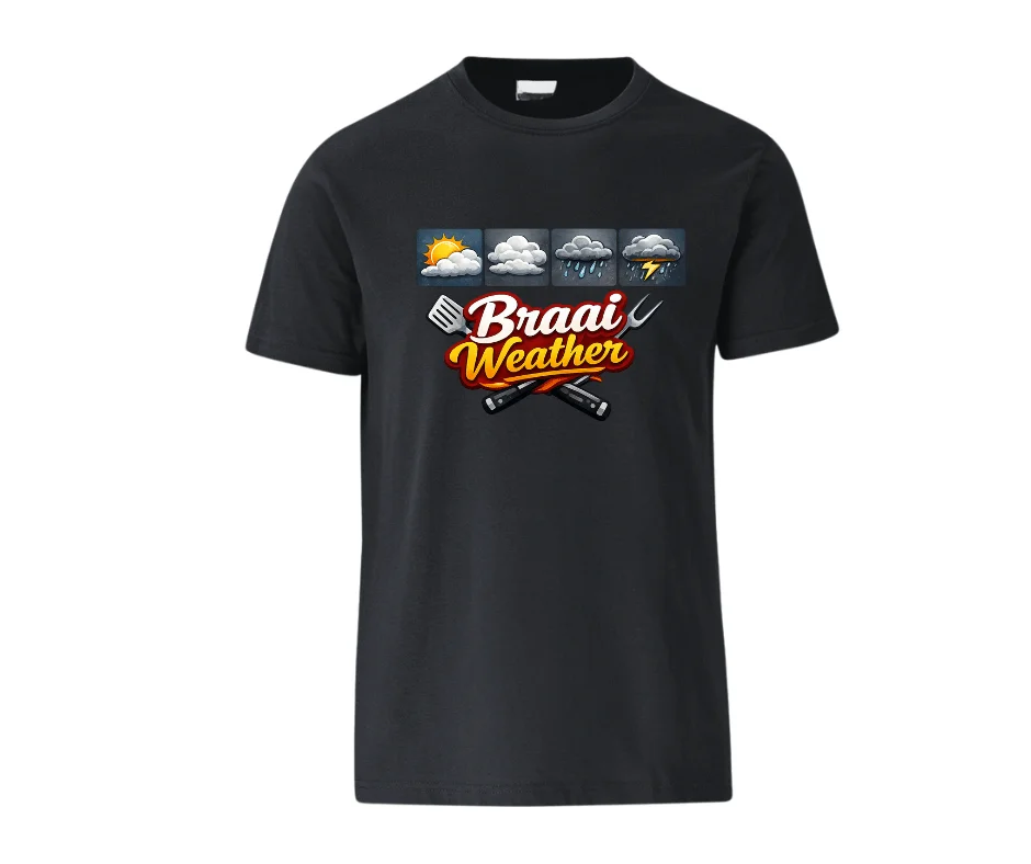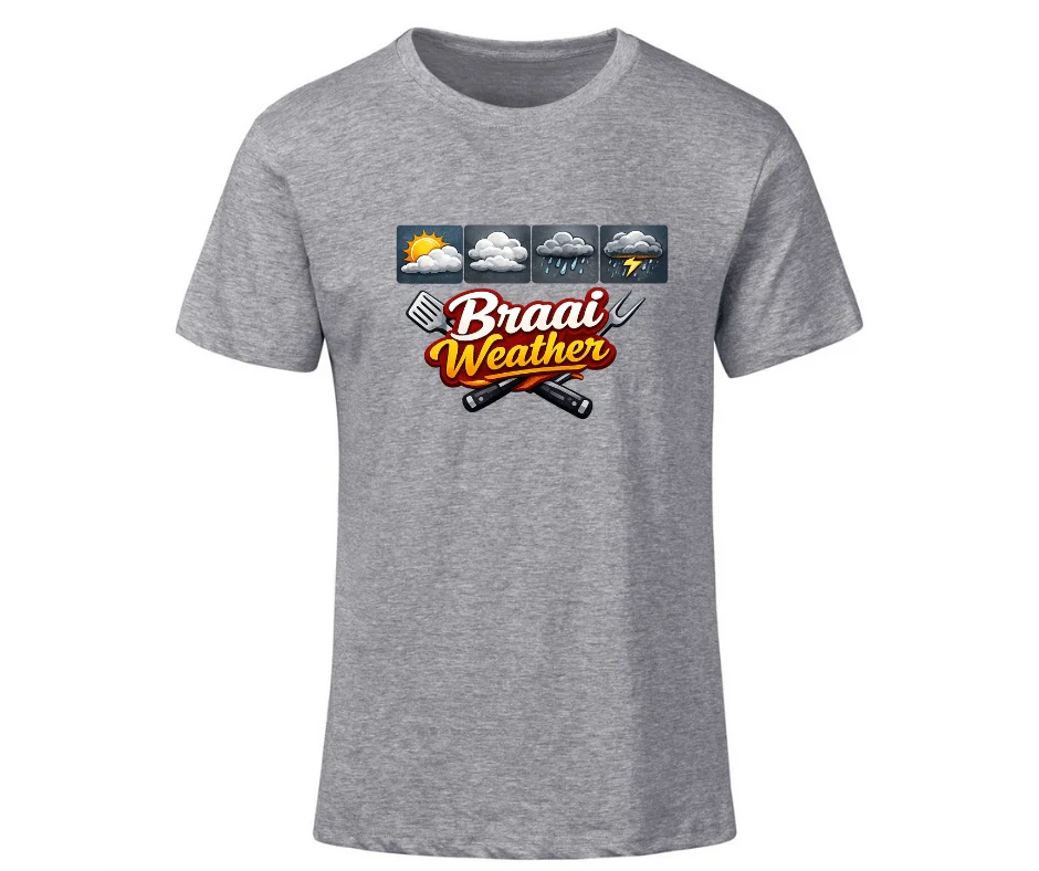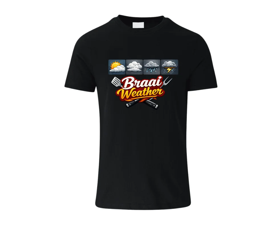 A bold, fun tee for braai lovers — because every forecast is braai weather.