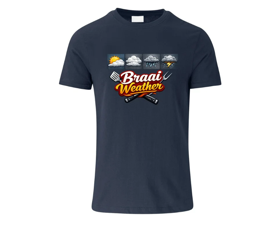 This tee says what every South African knows: the braai doesn’t get cancelled, it gets upgraded. Featuring a fun weather-forecast-style graphic with crossed braai tools, this shirt is made for die-hard braai lovers who grill through anything.