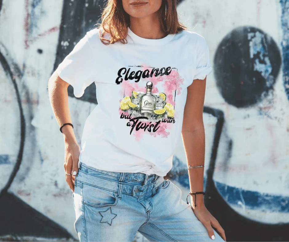 The “Elegance with a Twist” T-shirt blends sophistication with playful personality. Featuring a beautifully illustrated gin bottle, fresh lemon slices, and soft pink watercolor accents, this design is perfect for the modern woman who enjoys her style like her drink — refined, refreshing, and with a twist.