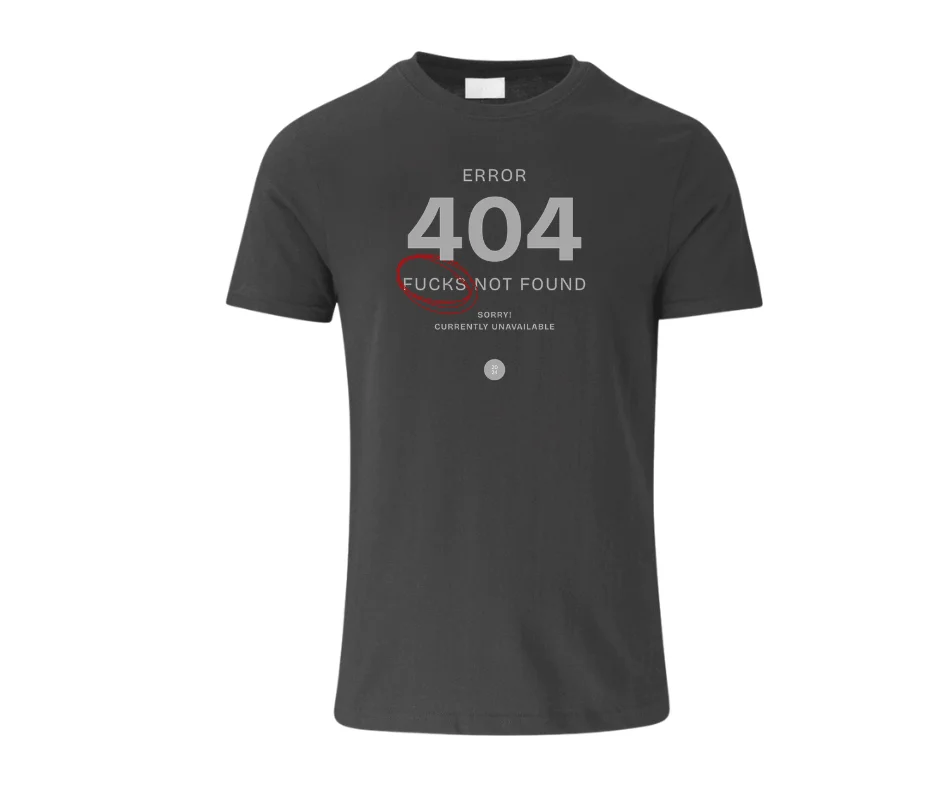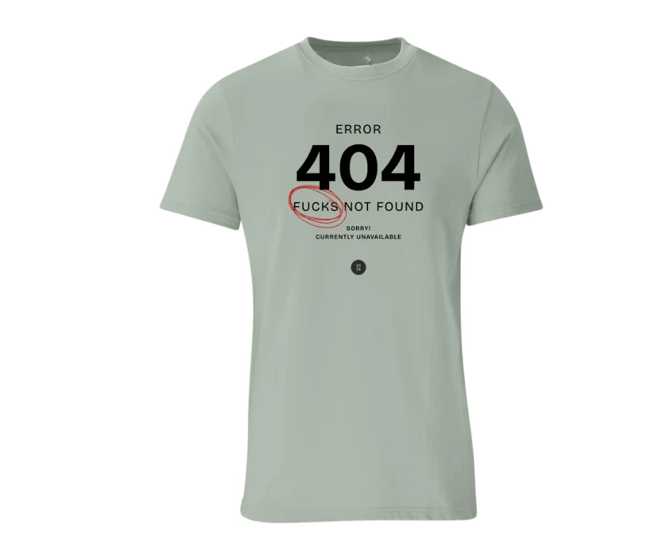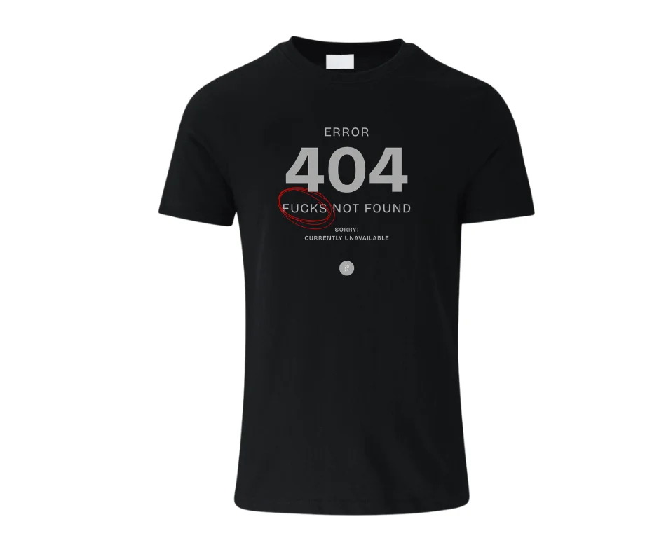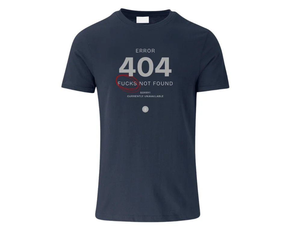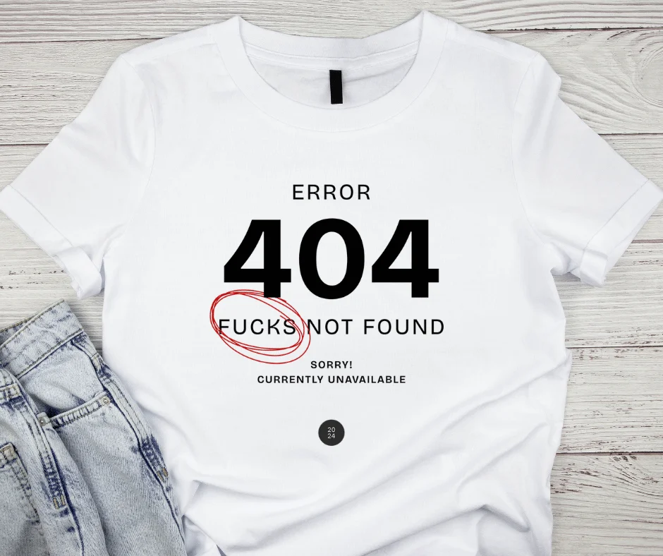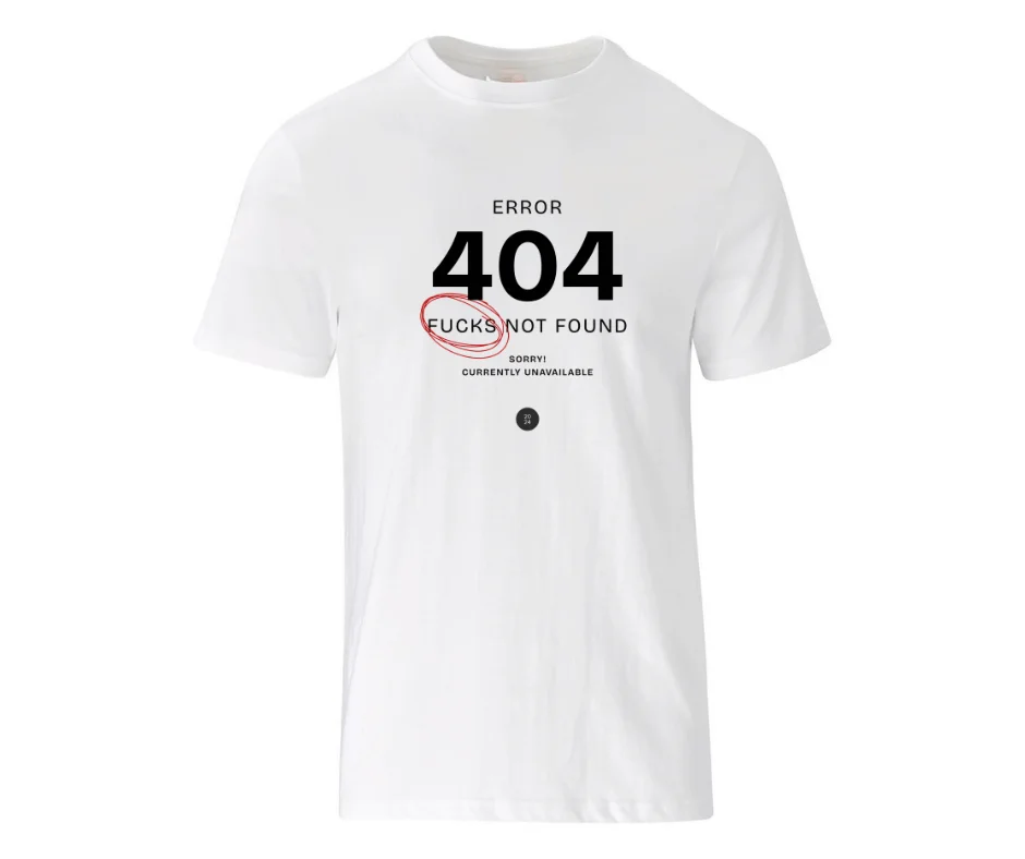 The “Error 404 – F*cks Not Found” T-shirt is the ultimate sarcastic statement piece for those who have officially run out of patience. Clean, minimalist design meets bold typography, with a cheeky red circle highlight that draws attention exactly where it should.