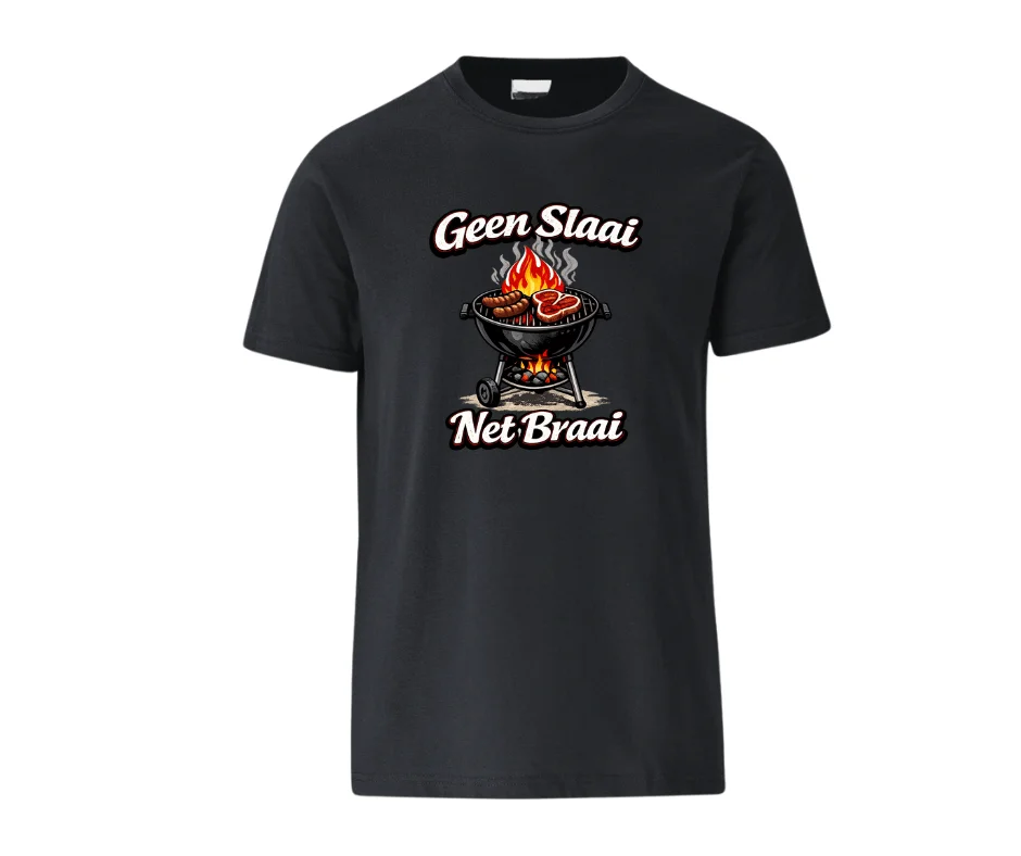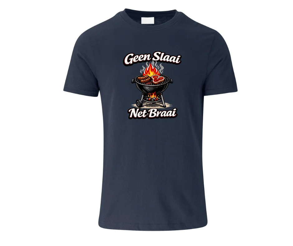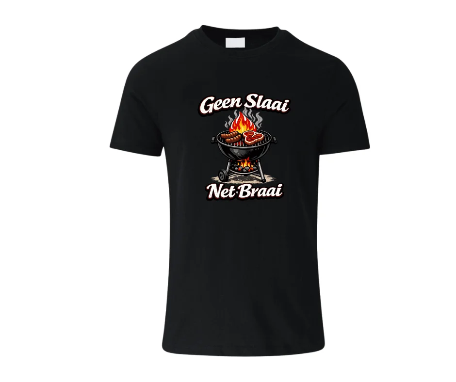 The “Geen Slaai, Net Braai” tee says what everyone’s thinking when the fire’s on and the tongs are out. Featuring a bold braai graphic with sizzling meat and flames, this shirt is made for true braai purists who believe vegetables belong near the fire… not on the plate.