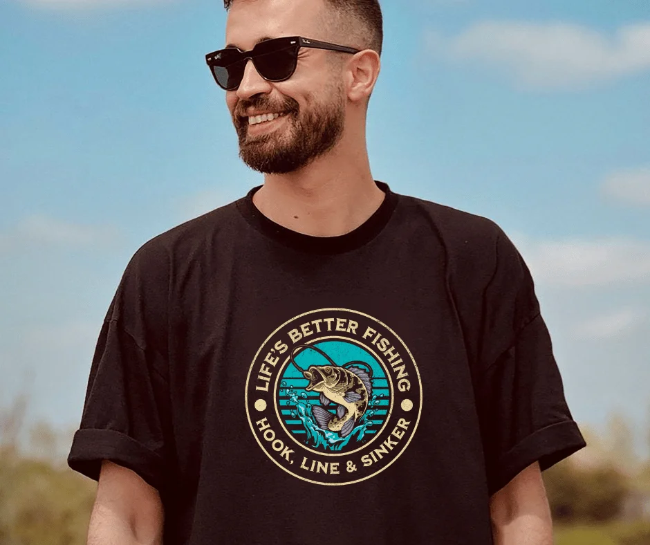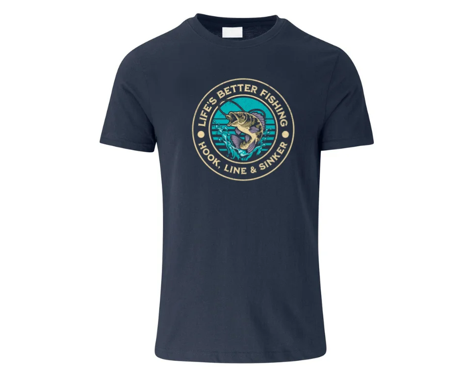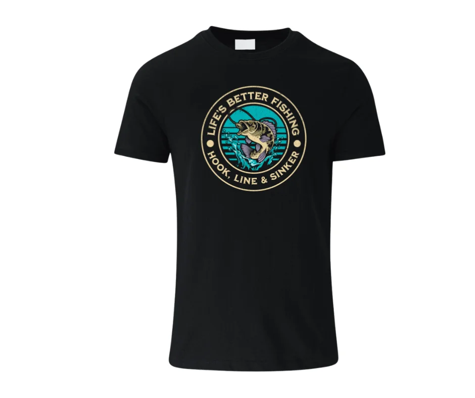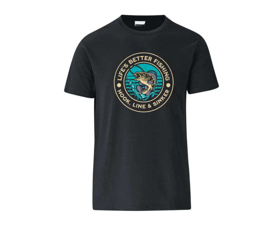 The Life’s Better Fishing – Hook, Line & Sinker T-Shirt celebrates the thrill of the catch and the calm of the water, wrapped in a bold, classic fishing emblem design that never goes out of style.