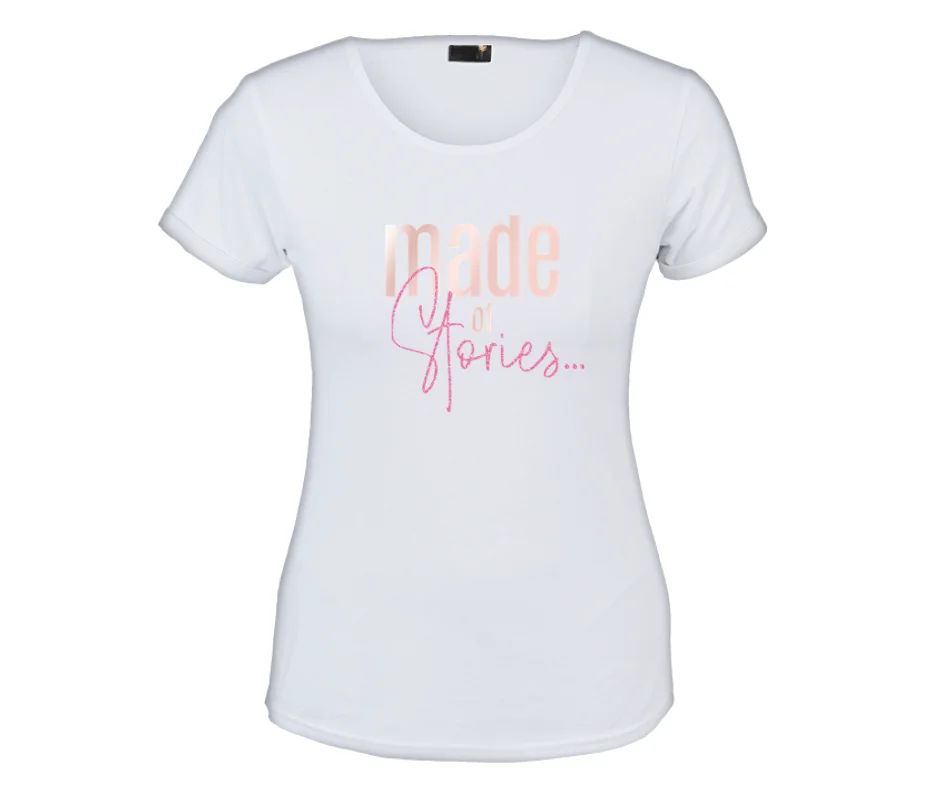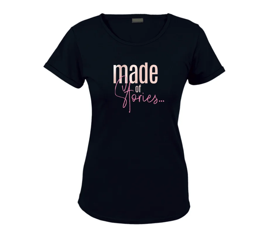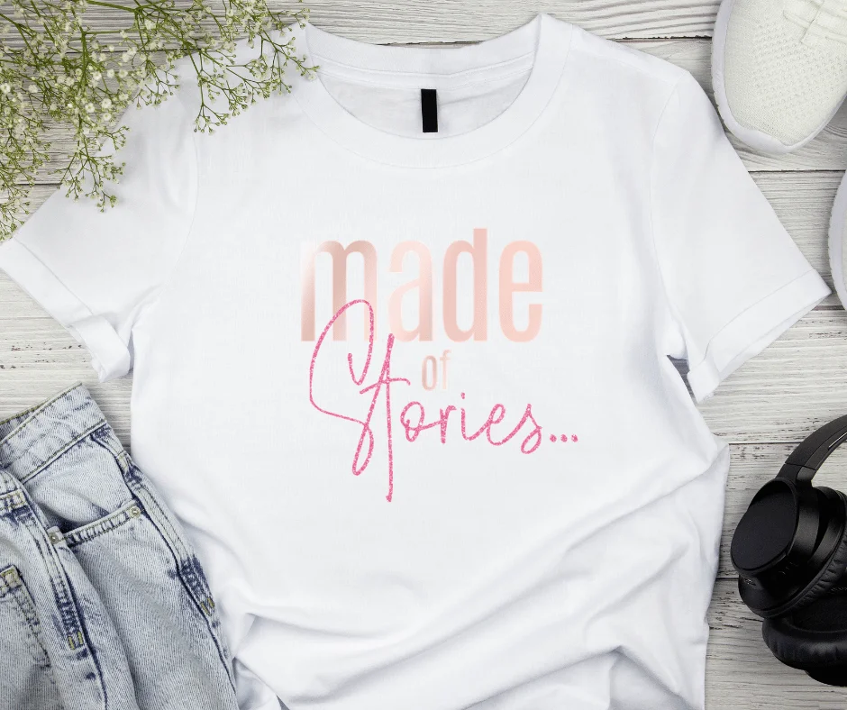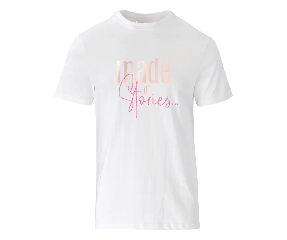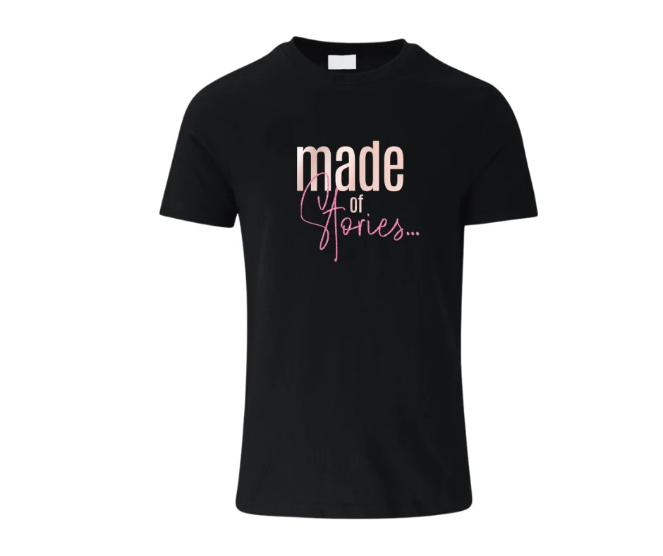 The “Made of Stories…” women’s graphic tee is a beautiful reminder that who you are today is shaped by the chapters you’ve lived. Designed with a soft blush “made” paired with elegant pink script typography, this shirt blends strength and femininity in one simple yet powerful statement.