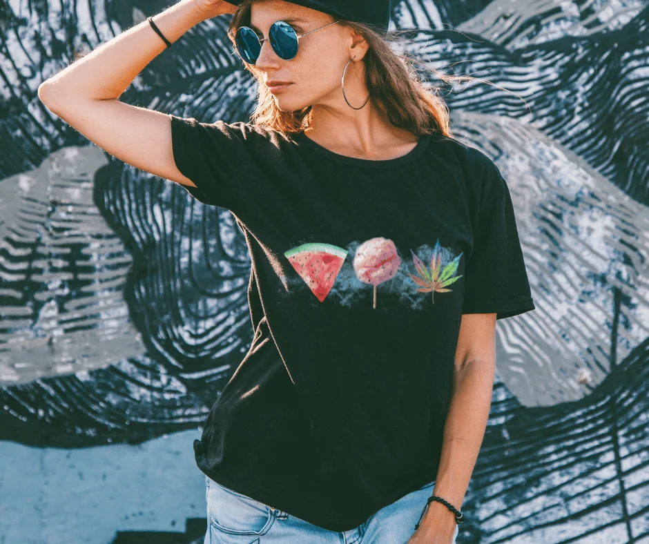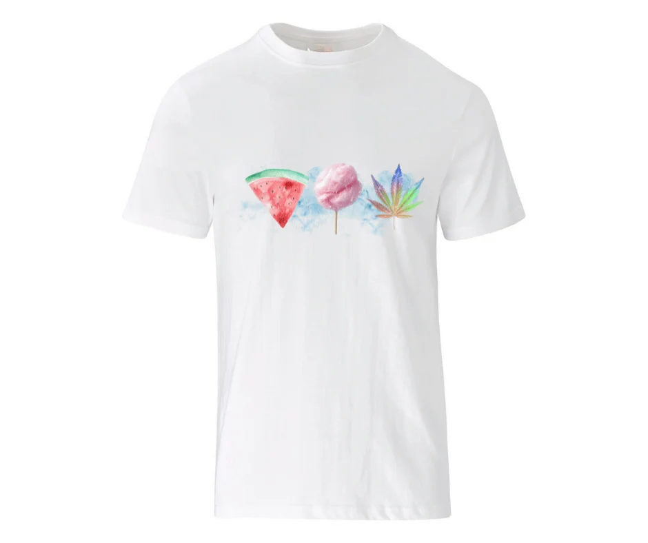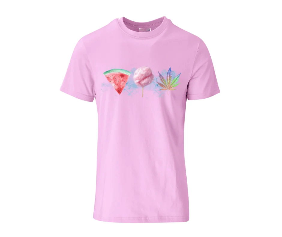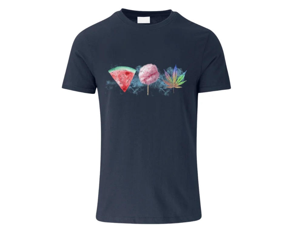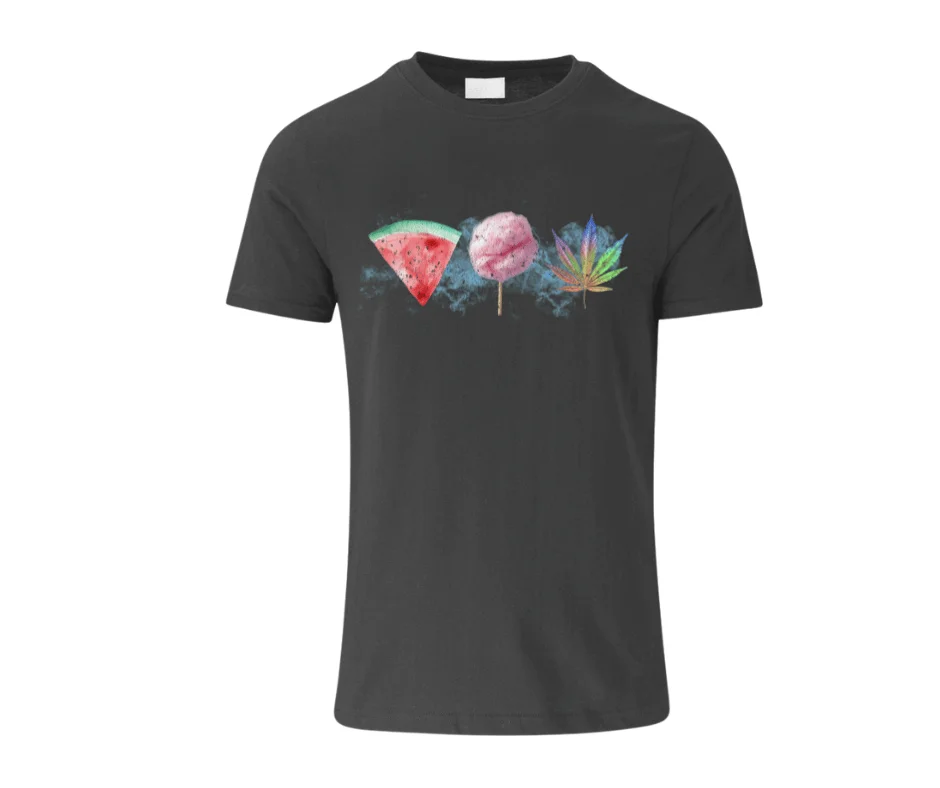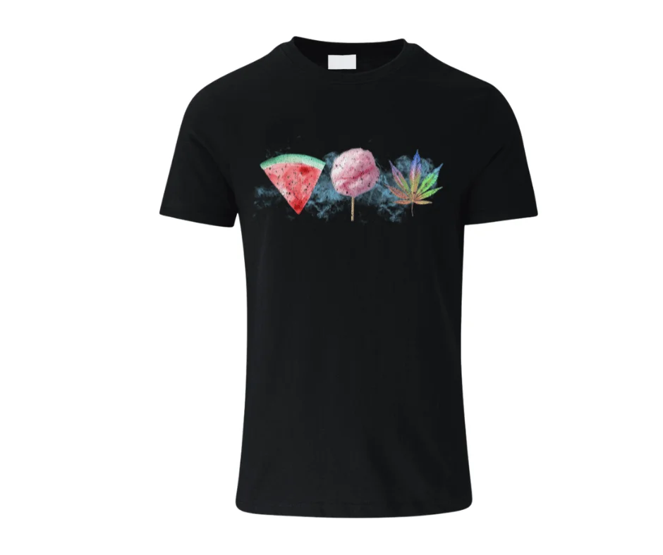This eye-catching graphic tee combines three iconic elements — a juicy watermelon slice, fluffy pink candy floss, and a vibrant leaf — set against a smoky, artistic backdrop on a sleek black shirt. The result? A bold statement piece that blends fun, flavour, and attitude into one unique design.