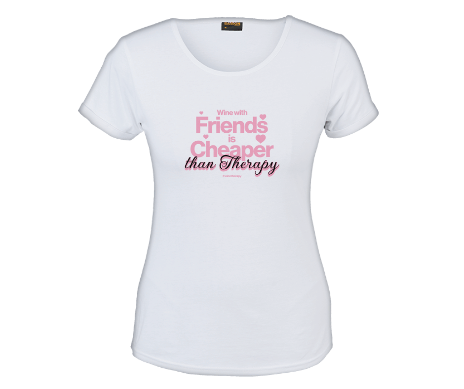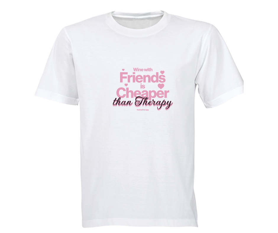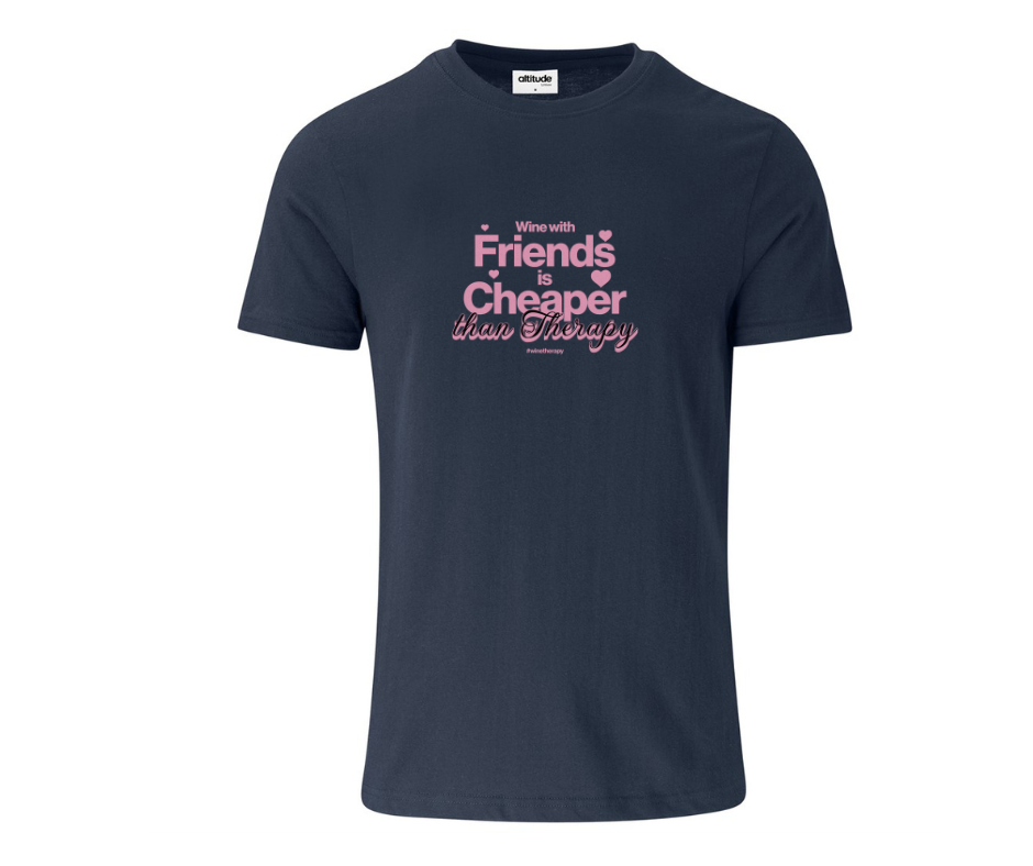 This feel-good tee says it all with the cheeky and oh-so-true phrase “Wine with friends is cheaper than therapy.” Designed for wine nights, heart-to-hearts, and those moments where a glass (or two) and good company fix everything.