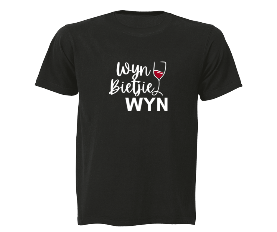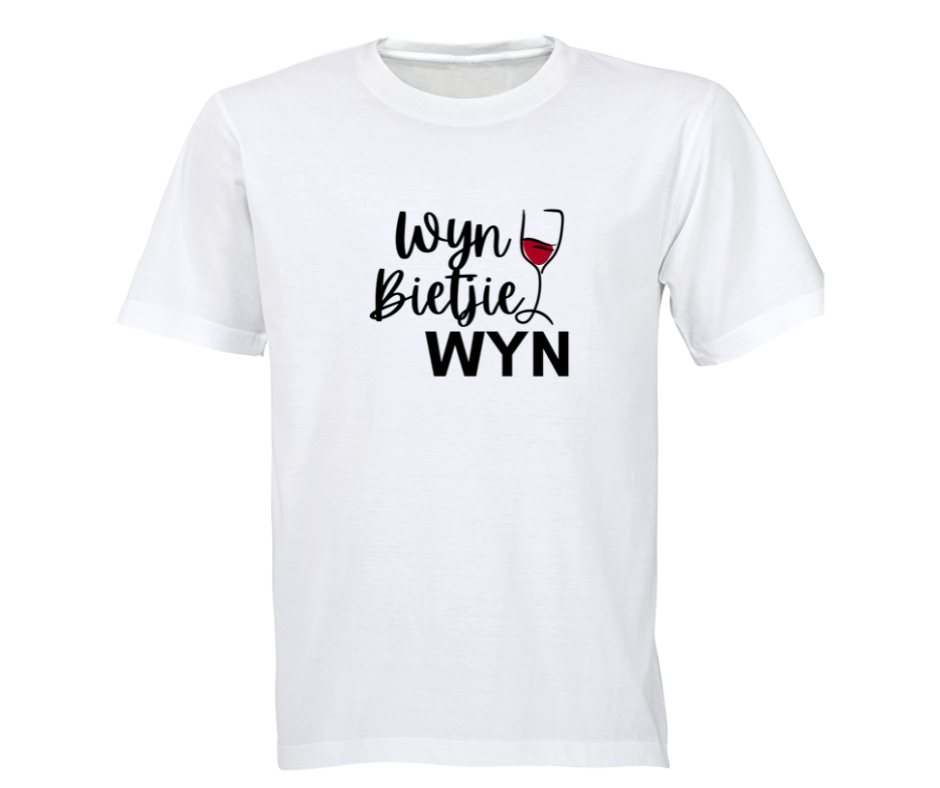Because one glass is never enough! 🍷😂 Our “Wyn, Bietjie Wyn” T-shirt is perfect for those who know that a little wine makes everything better! Whether you’re at a braai, kuier, or just winding down after a long day, this fun Afrikaans-inspired tee lets the world know exactly what’s on your mind—just a little more wine!